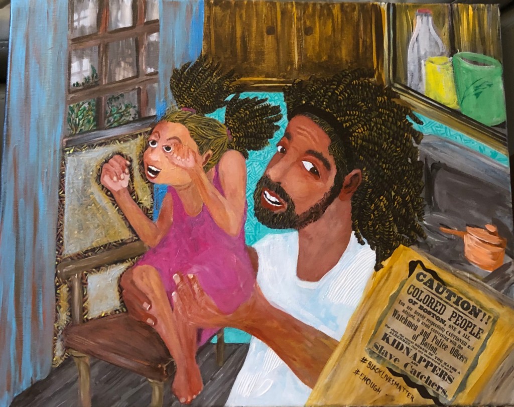 Acrylic on canvas. “Her America” is part of the America 2 Me series of paintings using a premise of caution. The original flyer used in the #BlackLivesMatter protests held in Los Angeles and Boston during the summer of 2020.