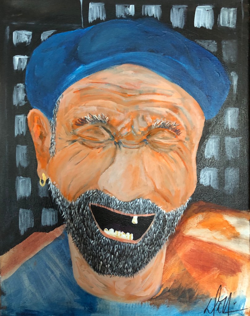 So my story is in bits and pieces, seemingly disconnected, as if I’m living multiple lifetimes all at once. But for the past four years, I’ve been painting continuously after nearly dying, when my body began shutting down for no apparent reason. And when it stopped attacking itself, I was left deaf in one ear, had permanent lung damage and was released from the hospital with my companion, a walker meant for an old lady. I was 56 years old.